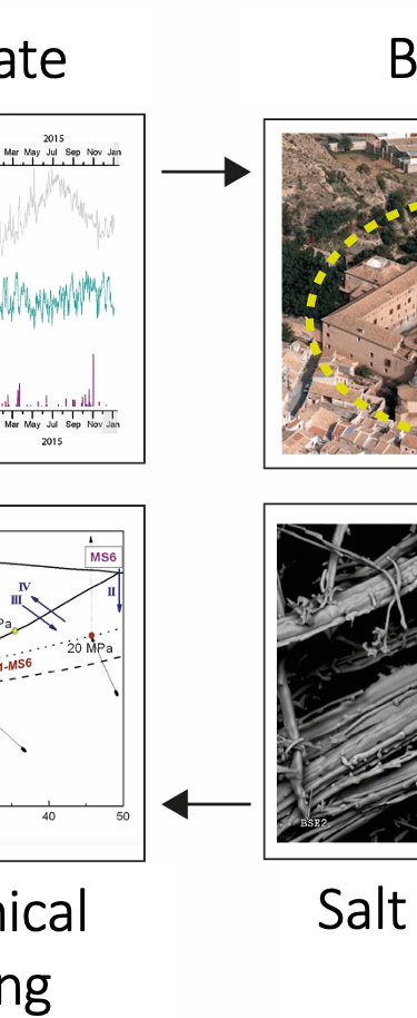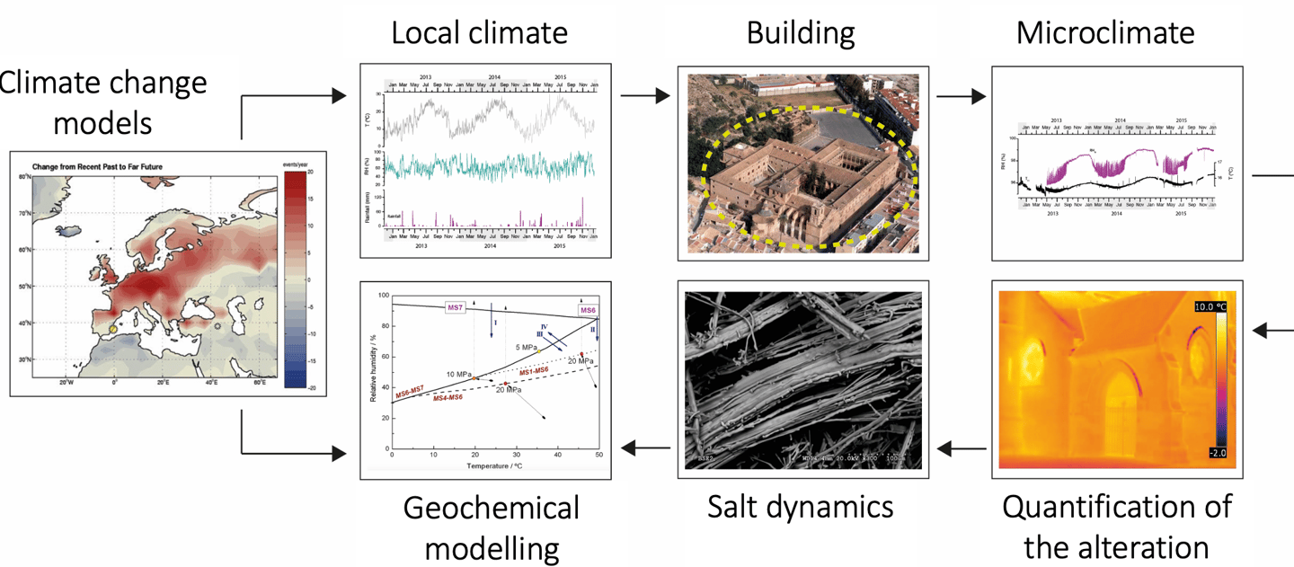 Objectives: This project aims to develop innovative tools, strategies, and guidelines that mitigate the detrimental effects environmental factors, ensuring the long-term preservation of our valuable cultural heritage. It is expected to achieve the following scientific impacts: (i) Parametrization of changes in the microclimate through the evaluation of different future scenarios of climate change; (ii) Development of a novel methodology enabling salt crystallisation modelling and simulation within building materials by altering thermohygrometric conditions; (ii) Conducting data and time series analyses of climatic and microclimatic temporal patterns to understand the relationship between thermo-hygrometric conditions and the deterioration of historic buildings. The definition of proxies for alterations caused by climatic events in the past will be integrated into a global predictive model that addresses stone alteration due to salt crystallisation induced by seasonal meteorological fluctuations or medium- to long-term climate changes using climate change projections.